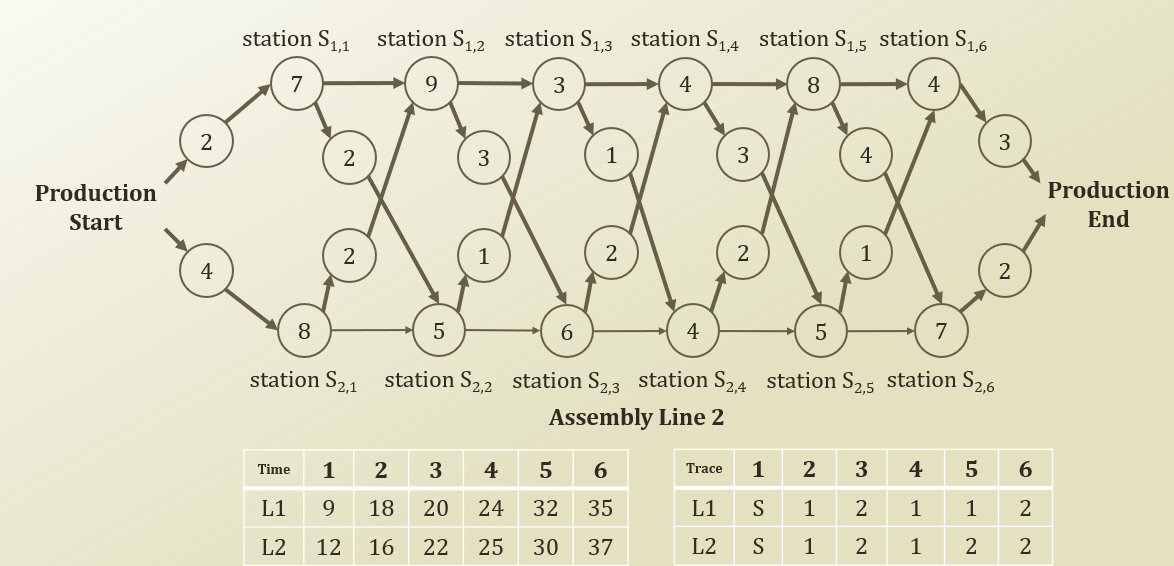 memoization table로 각 station의 min time을 저장하고, trace table에 최적 path 이전 station을 저장한다. 이를 통해 최적 path를 problem groth를 통한 DP로 구할 수 있게 된다.