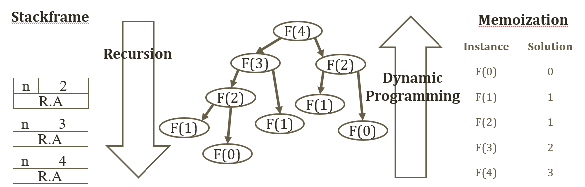 recursion은 top-down 으로 task의 맨 위, 즉 F(4) 부터 함수를 호출해가며 문제를 해결한다. 반면 DP는 가장 작은 sub instance인 F(0) 부터 그 결과를 memoization에 저장해가며 bottom-up 으로 문제를 해결한다. recusion의 overlapped functin call이 많다면 DP를 통해 메모리 효율을 높이는게 좋다.