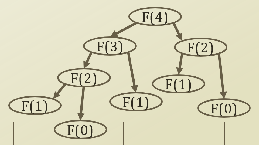 F(4)가 가장 먼저 호출되고, n이 0, 1 아니므로 result에 F(3)이 호출되어 다시 함수 위로 올라간다. F(n-2)는 호출되지도 목한다. 그다음 F(2), F(1) 이 차례로 호출되고 F(1)에서 return이 발생하므로 재귀를 빠져나와 F(n-2) (= F(0))를 호출한다.