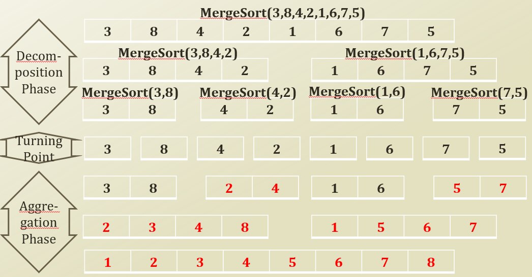 주어진 list를 반으로 decompose해서 single value 까지 내려간뒤, 대소를 비교해 sort해서 합친다(aggregation).