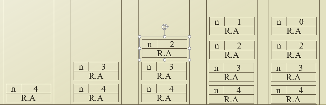 function call history를 저장하는 stack. 함수가 호출될 때 push 되고 return 될 때 pop 된다. R.A(return address)와 함수가 호출될 때 파라미터를 저장한다. F(1)이 return되면서 pop되어 stackframe에서 빠지고 그 다음 호출된 F(0)이 stack에 push 된다.